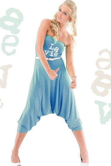 Модный комбинезон со штанами "Аладдинами" ярко-голубого цвета и верхом "бандо".
