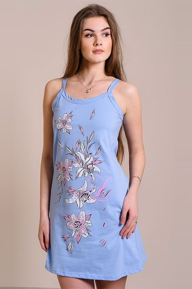 Красивая голубая сорочка с принтом "Лилии" впереди, модель свободного покроя, на широких бретельках.